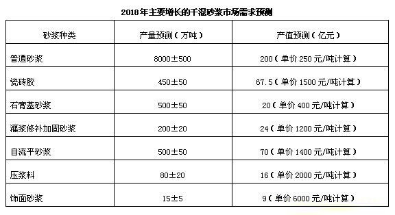 2013年,由于年初大面積、長時間的霧霾事件,引起了政府的高度重視,從國務院到各省市政府紛紛出臺大氣污染防治政策。“建筑揚塵”成為眾矢之的,禁止 現(xiàn)場攪拌砂漿的力度提升到前所未有的高度。從發(fā)展趨勢來看,無論建筑市場如何波動,干混砂漿都將保持兩位數(shù)的增長。未來幾年期內(nèi),我國干混砂漿市場將有一 個較快幅度的穩(wěn)定增長。經(jīng)匯總專家、顧問意見,采用類比法、德菲爾法等綜合測算, 2018年各類砂漿市場預測統(tǒng)計: